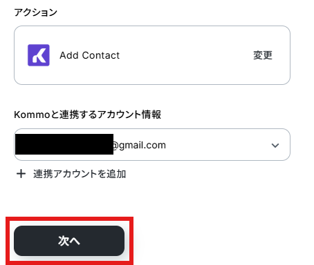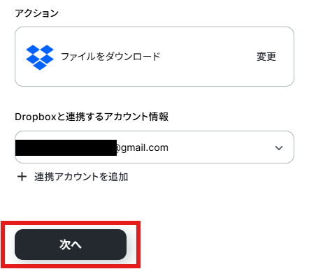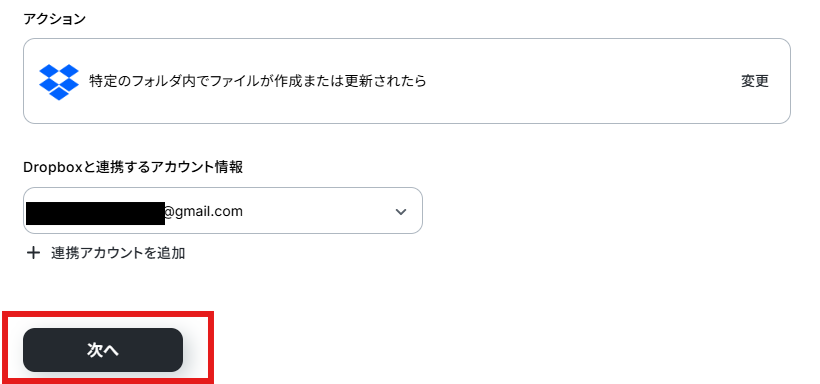 アクションはデフォルト設定のまま、アカウント情報は、連携したいアカウントが選択されているか確認してください。確認出来たら「次へ」をクリックしましょう。