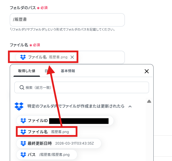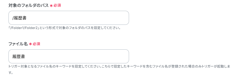 - Dropboxのトリガー設定では、監視対象としたいフォルダのパスやファイル名を任意で設定してください。