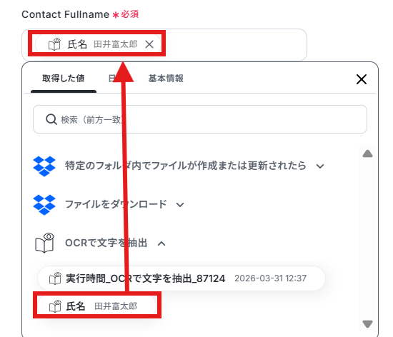 「Contact Fullname」を以下のように、前ステップの取得した値から入力します。