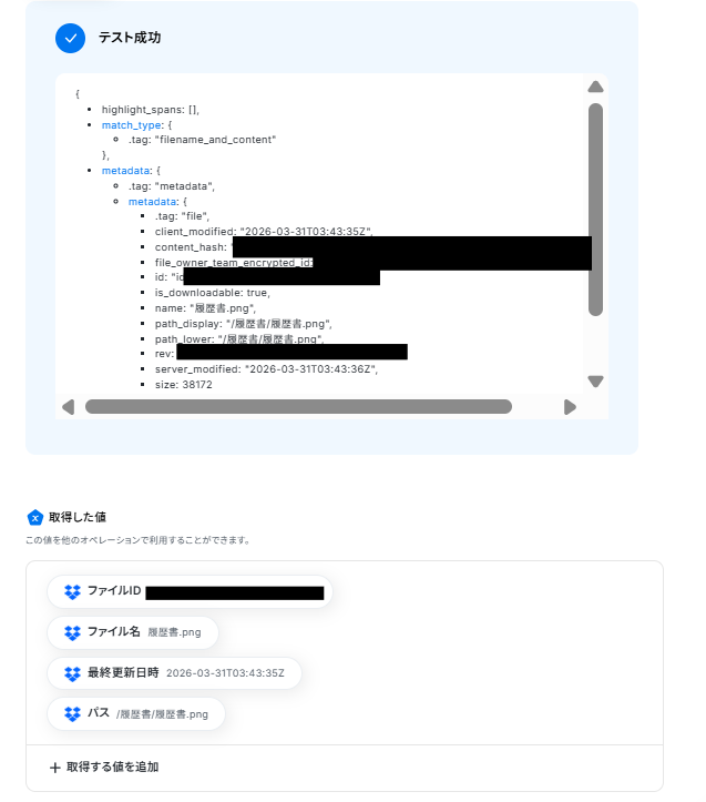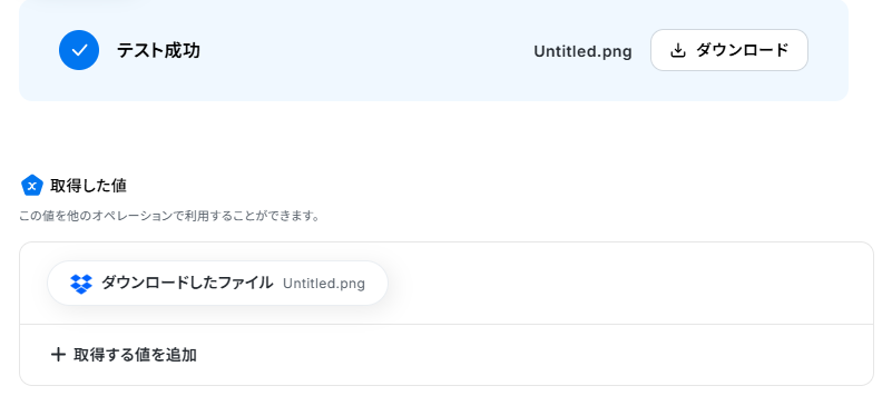 取得した値とは、トリガーやオペレーション設定時に、「テスト」を実行して取得した値のことを指します。