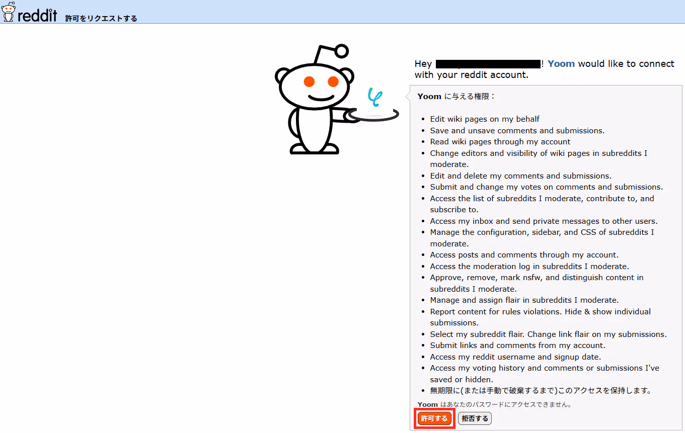 「許可する」をクリックするとRedditのマイアプリ連携が完了します。
