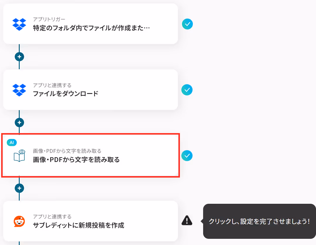 DropboxにアップロードされたファイルのテキストをOCRで読み取った後、更にAIがその内容を自動で要約してRedditに投稿するフローです。