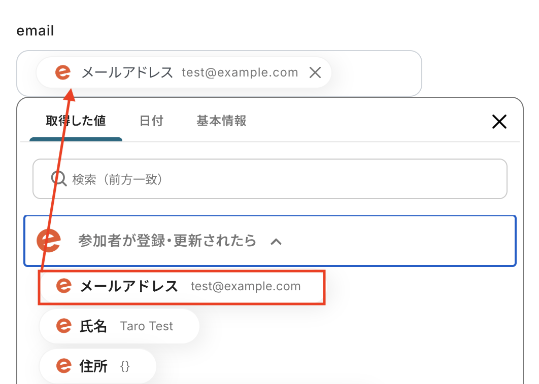 email こちらもnameと同様に、入力欄をクリックすると取得した値が表示されるので選択して入力が可能です。
