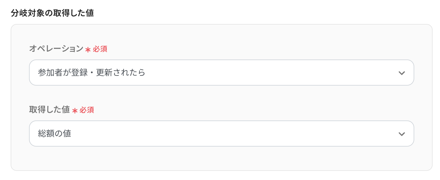 2.オペレーションは「参加者が登録・更新されたら」、取得した値に「総額の値」を選択します。