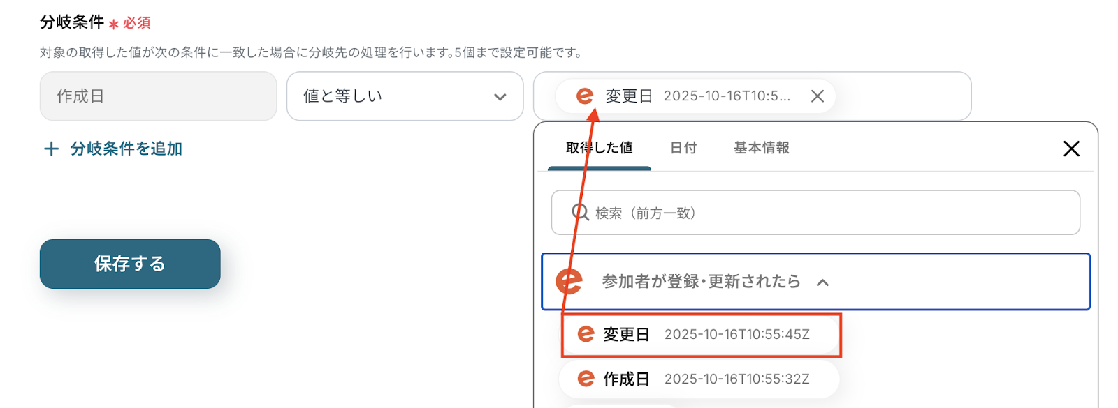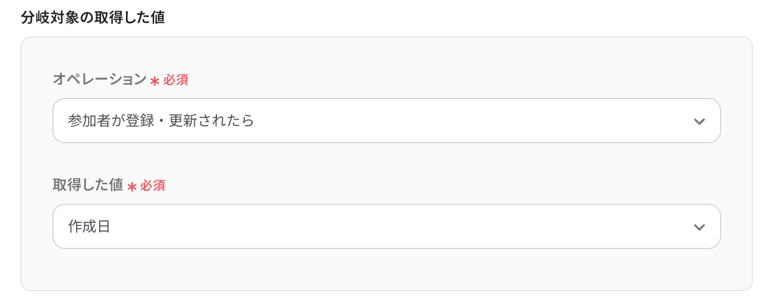 取得した値 デフォルトで「作成日」が選択されています。 新たに参加者が登録された日を基準に処理を分ける設定です。