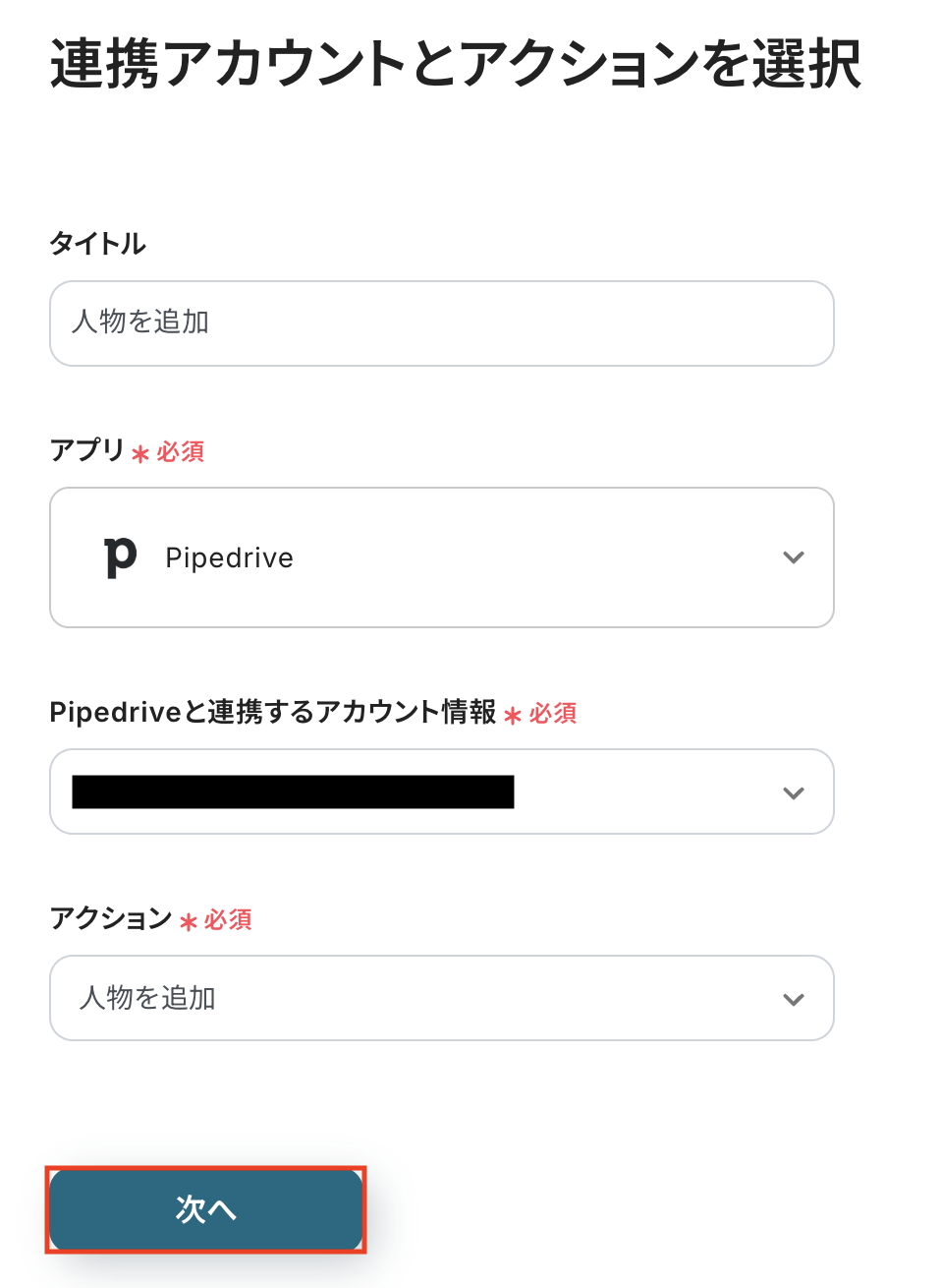 Pipedriveと連携するアカウント情報に問題がなければ、「次へ」をクリックします。