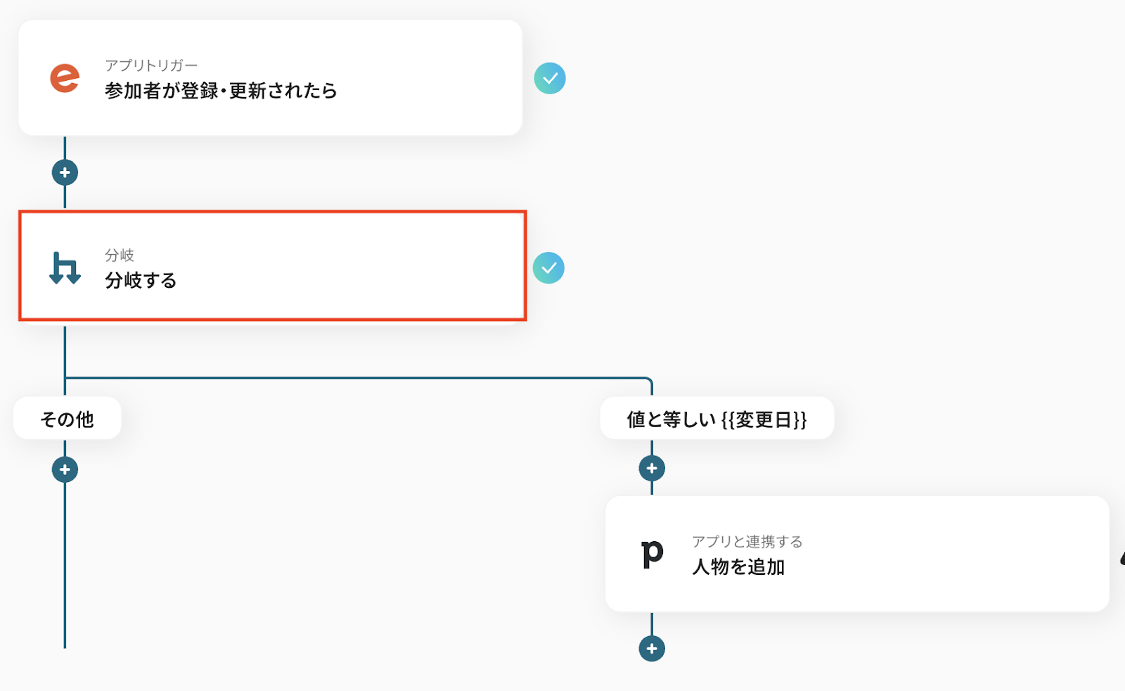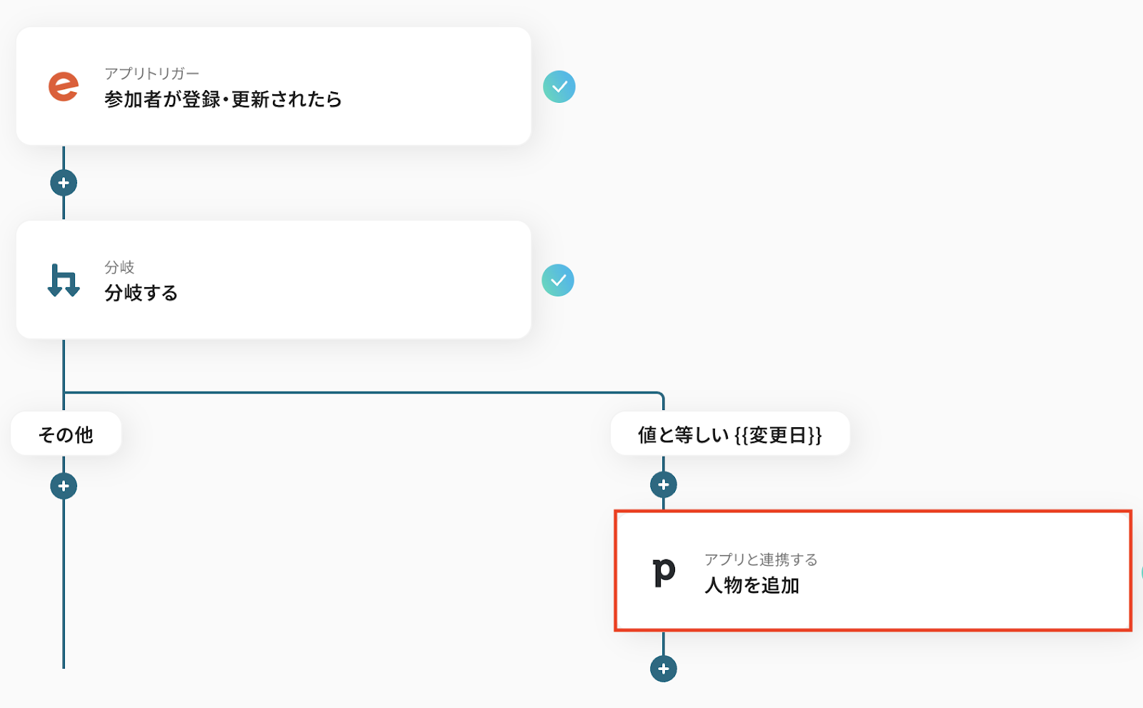 この設定により、支払い総額が0円より大きい参加者(=有料チケット購入者)のみを連携するフローを構築できます。 結果として無料イベントの参加者を除外し、有料プラン購入者など見込み度の高い参加者だけをPipedriveに人物として自動追加することが可能になります。
