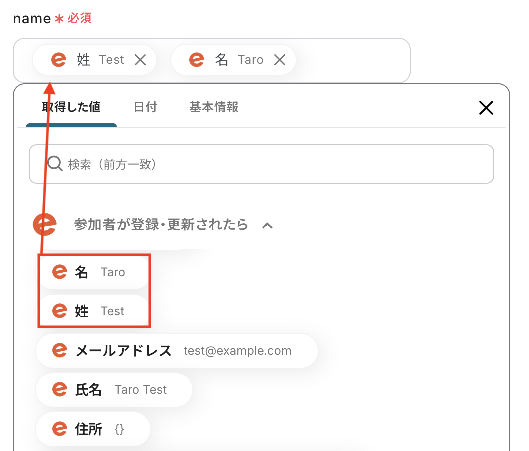 name 入力欄をクリックすると、前のステップでEventbriteから取得した値が表示されるので、選択して入力しましょう。 取得した値を活用することで値が固定化されず、フローボットを起動するたびに最新の情報を自動で反映できます。なお、テキストを直接入力した部分は固定値とされるため、取得した値を活用せず設定を行うと毎回同じデータがPipedriveに登録されてしまうので注意が必要です。