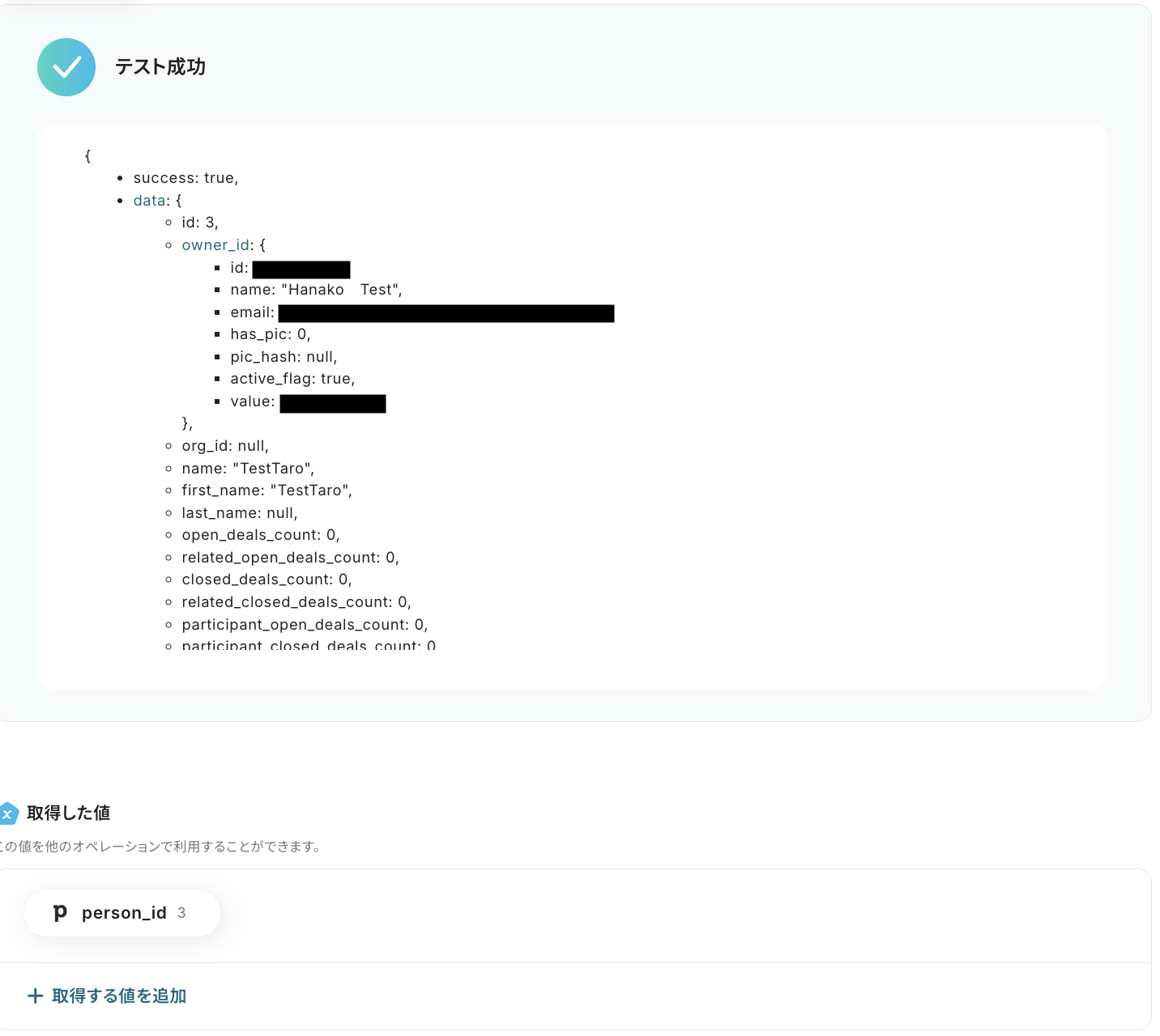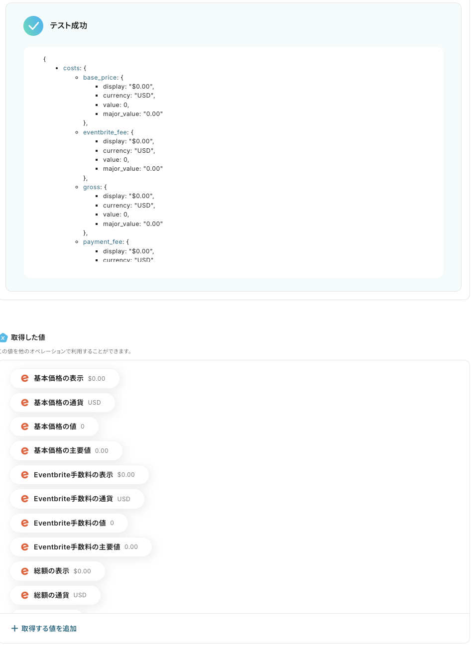 テストに成功すると、Eventbriteに登録された参加者に関する情報が一覧で表示されます。 以下の画像の取得した値を利用して、Pipedriveへ人物の追加が可能です。