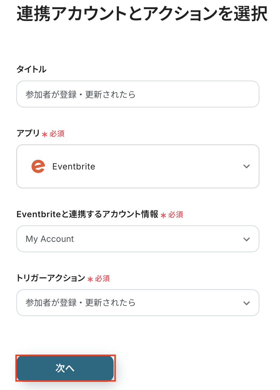 Eventbriteと連携するアカウント情報に問題がなければ、「次へ」をクリックします。