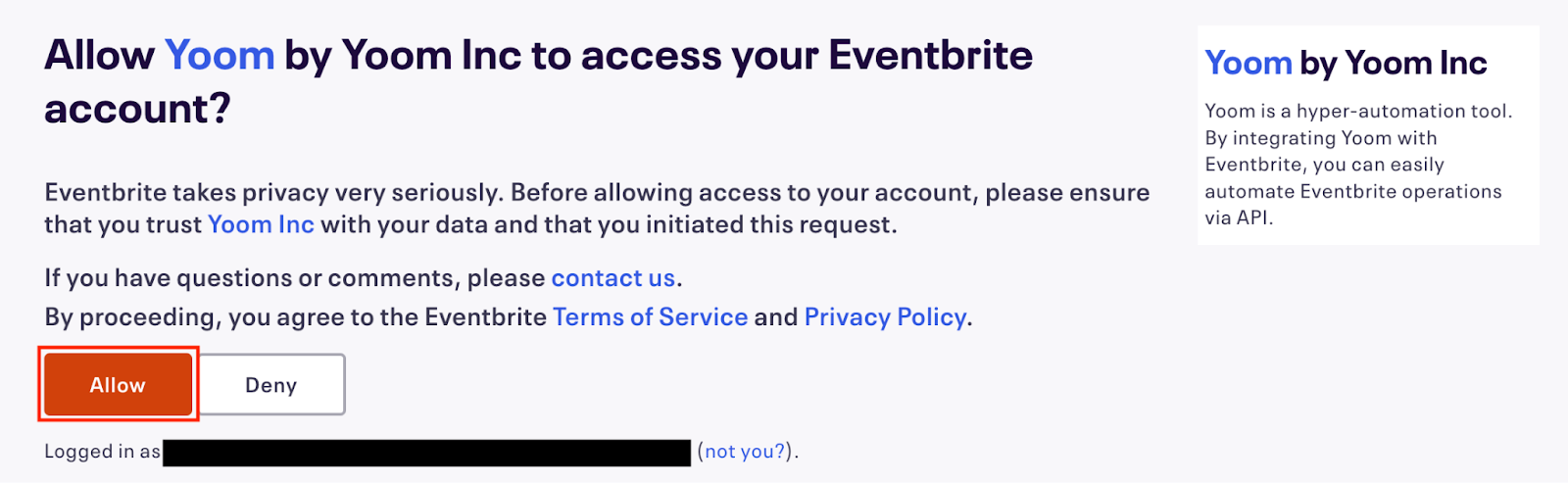 任意のアカウントでEventbriteにログインすると、アクセス権限を求める以下の画面が表示されます。 内容を確認し、「Allow」をクリックしてください。