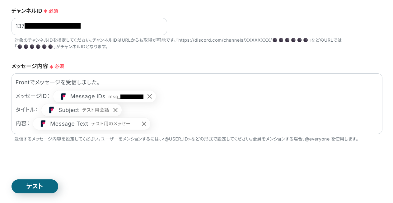 - 「チャンネルID」に、メッセージを送信するチャンネルのIDを設定。