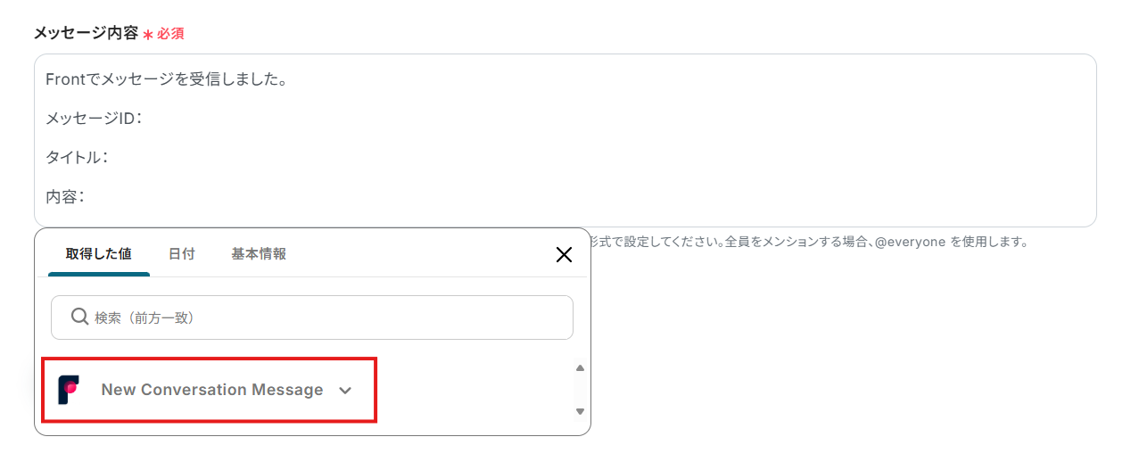 このワークフローを活用すれば、Frontで新しいメッセージを受信した際に、指定したDiscordチャンネルへ自動で通知できます。