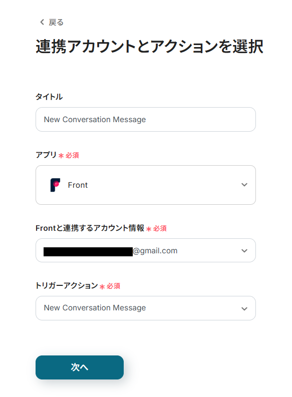 - 連携アカウントとアクションの内容を確認し、「次へ」をクリック。