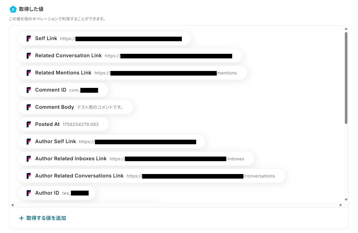 - テストに成功すると、「取得した値」に最新コメントの情報が追加されます。