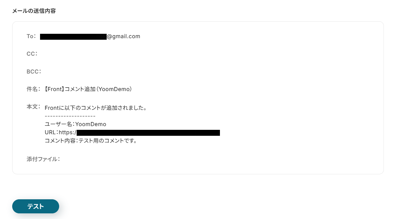 指定した宛先にメールが送信されるため、テストでは確認可能な宛先にしておくことをおすすめします。