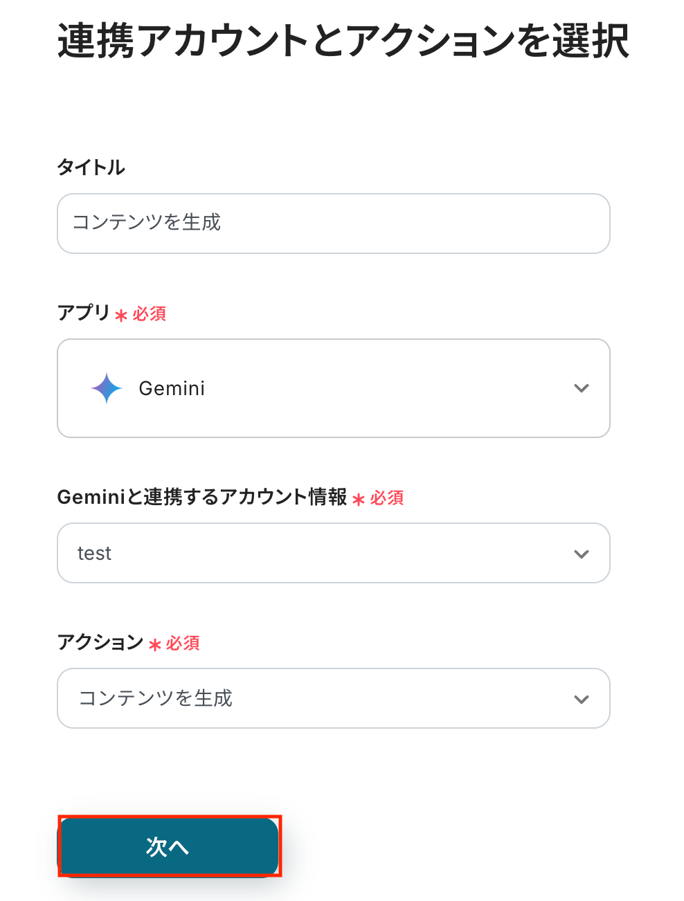 タイトルは任意で変更できます。 アプリとアクションはあらかじめ設定されているため、そのまま内容を確認してください。 Geminiと連携するアカウント情報に問題がなければ、「次へ」をクリックします。
