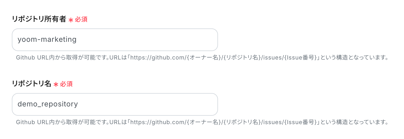 注釈に沿って入力しましょう。 ※GitHubURLの「オーナー名」がリポジトリ所有者になります。