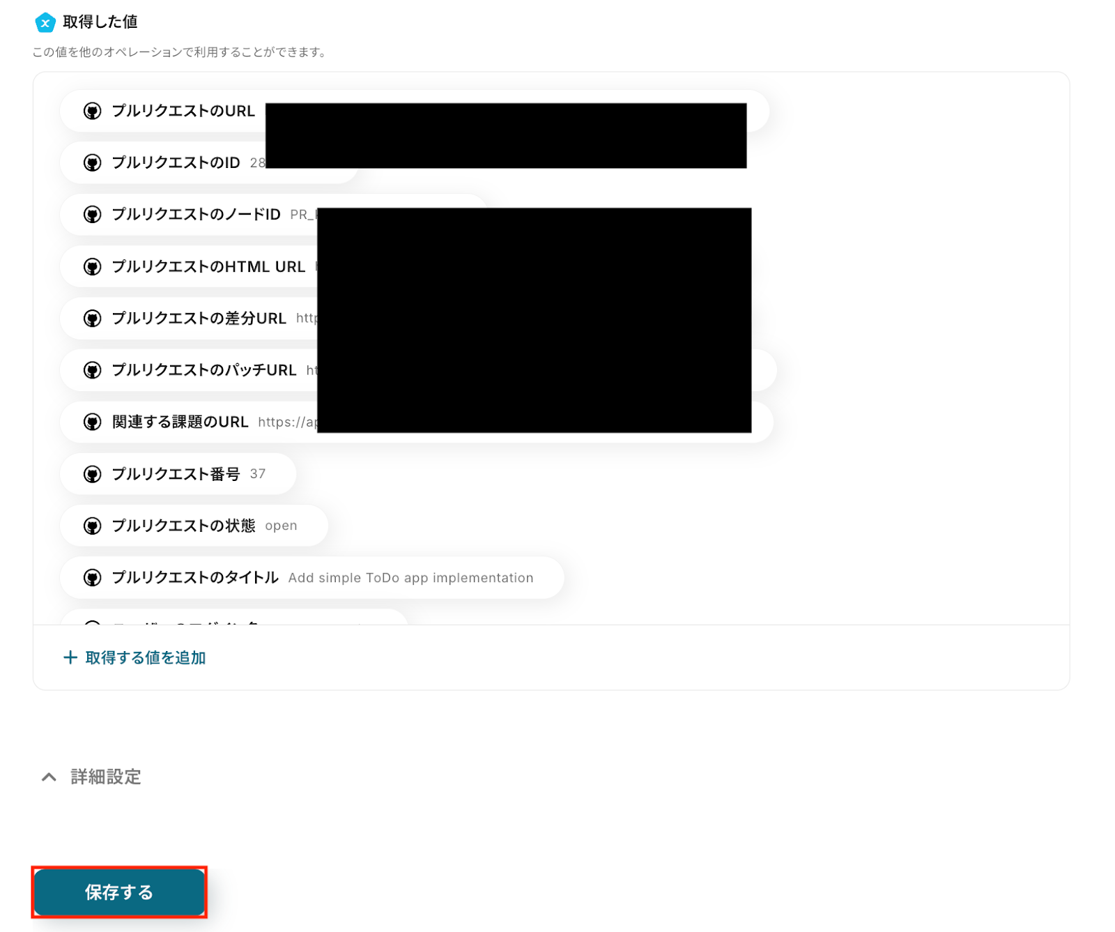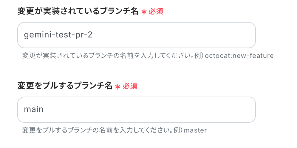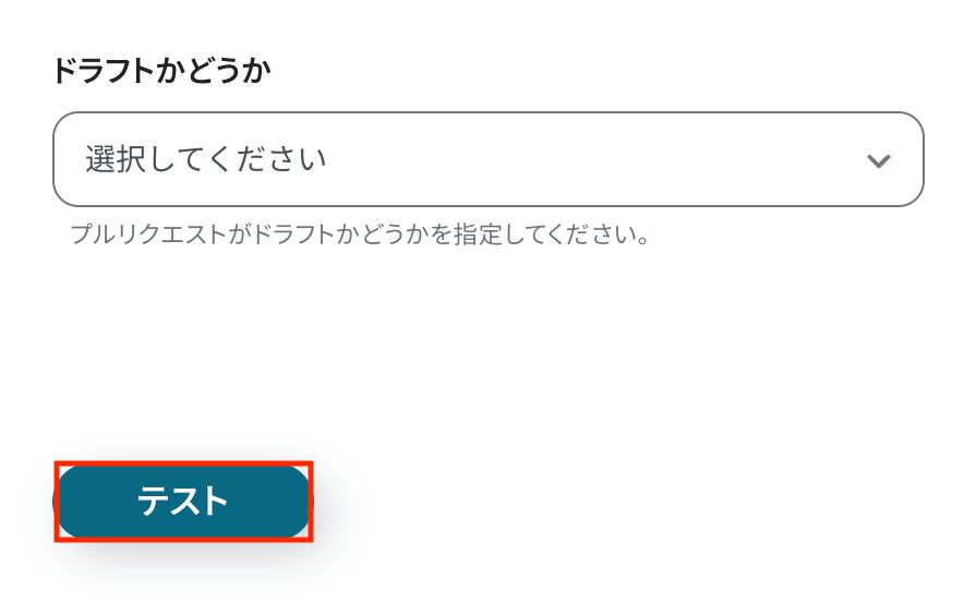 その他の項目についても、必要に応じて、注釈を参考に設定しましょう。 入力が完了したら「テスト」をクリックして、設定した内容でGitHubにプルリクエストが作成されるか確認してください。