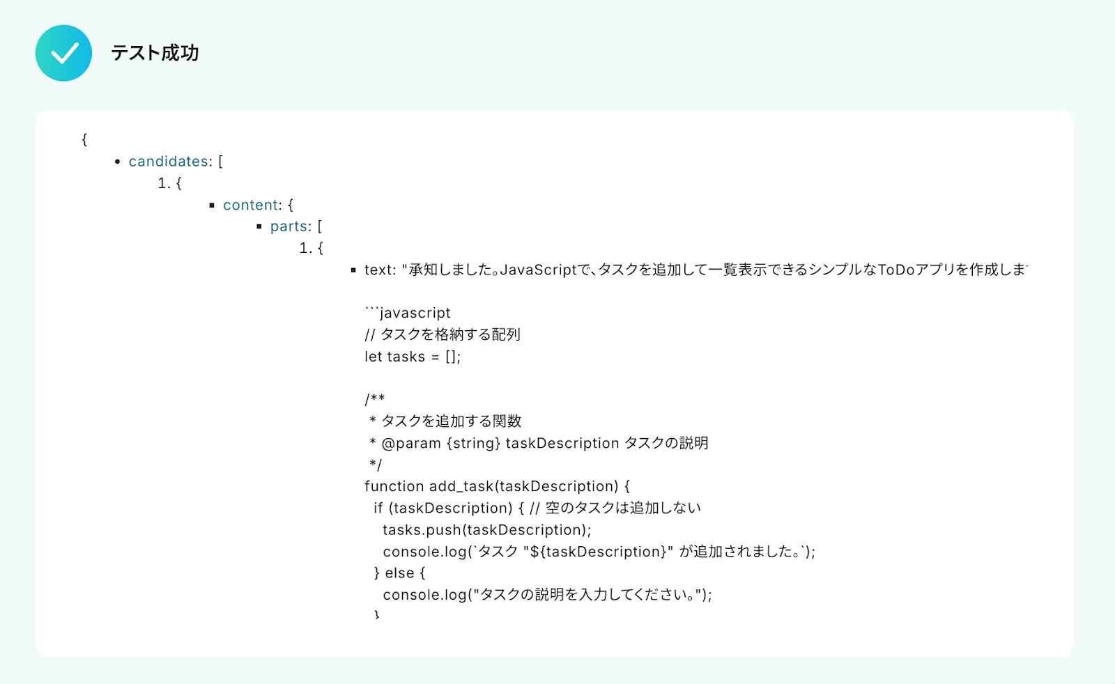テストが成功すると、トリガーのステップでフォームに入力したプロンプトをもとに、Geminiが生成したコンテンツの情報が表示されます。