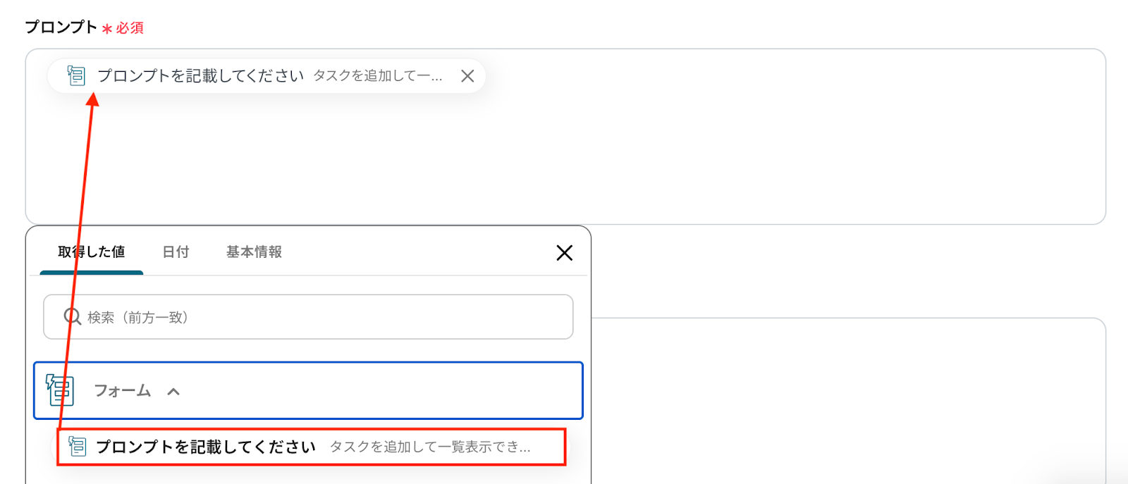 Geminiに生成させたい文章を指示するために、プロンプトを設定します。 入力欄をクリックすると、前のステップでフォームに入力したプロンプトが表示されるので、それを選択しましょう。 アウトプットを活用することで、値が固定化されずに毎回最新の情報を反映できます。 アウトプットに加え、定型的な指示を追加したい場合は、内容を直接入力してください。