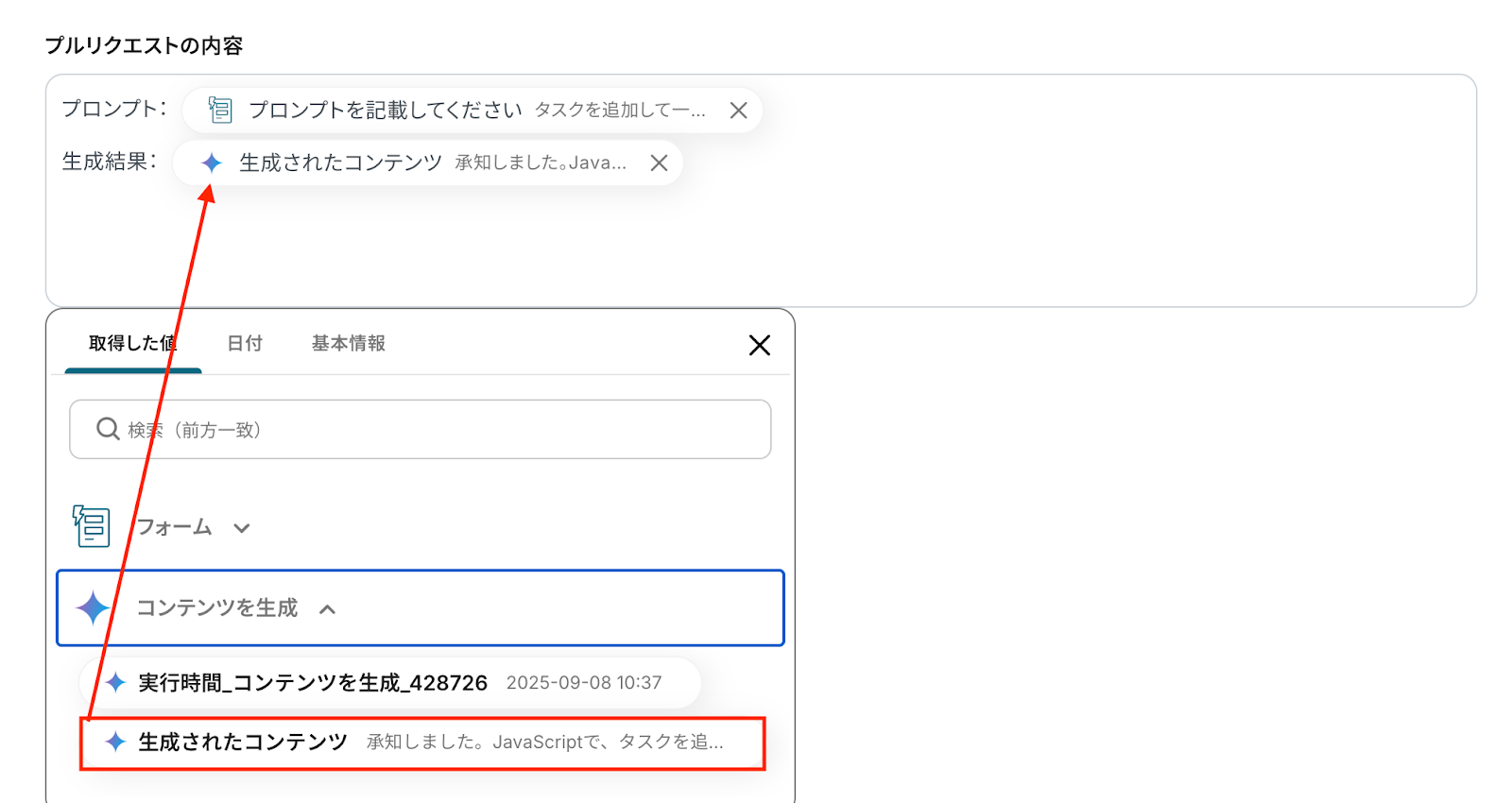 取得した値の項目に、テスト用のプロンプトを入力しておきましょう。 ここで入力した値(=取得した値 )は、この後のステップでGeminiによりコンテンツを生成する際に利用されます。