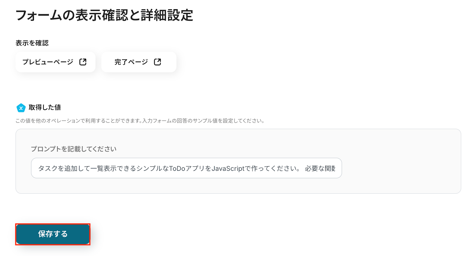 今回の例では、あらかじめ用意されているデフォルトのフォーム設定を使用し、プロンプトの送信フォームとして回答内容を活用する想定で進めます。