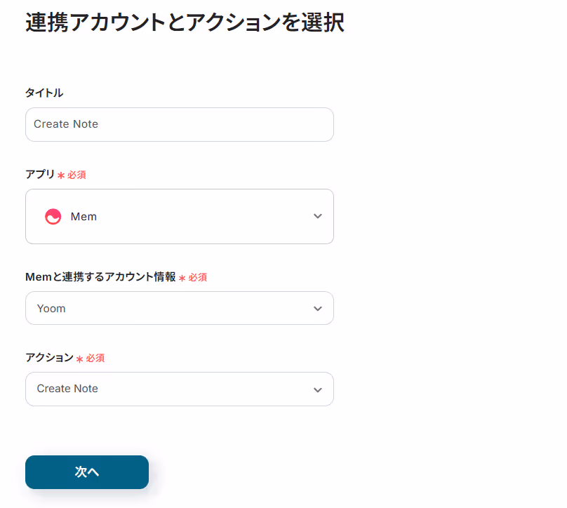 連携アカウントとアクションを選択する画面が表示されるので、今回連携するMemのアカウントを確認し「次へ」をクリックします。