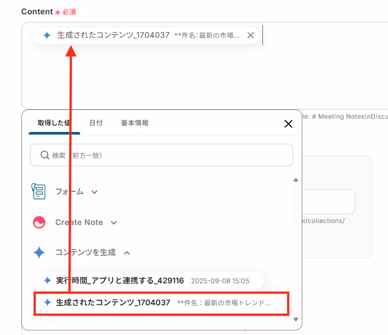 ContentにはGeminiの「取得した値」から生成されたコンテンツを選択し、要約内容を入力しましょう。