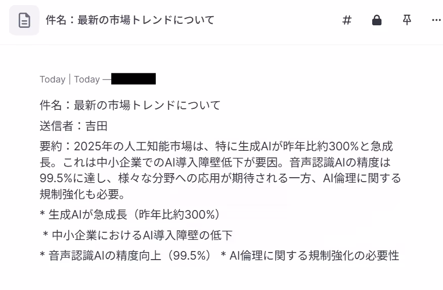 これにより、手動での要約作業が削減されるため、業務の効率化を図りたいときにおすすめです。