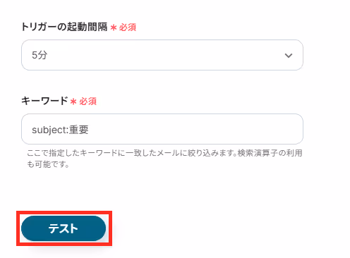 準備が完了したら、Yoomに戻り「テスト」を行いましょう。
