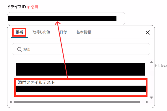 「格納先のGoogle DriveフォルダID」も、候補に連携済みのIDが表示されます。格納先を選択してください。