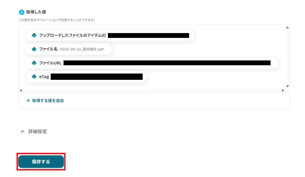 取得した値を確認し、テストに成功していれば「保存する」をクリックしましょう。
