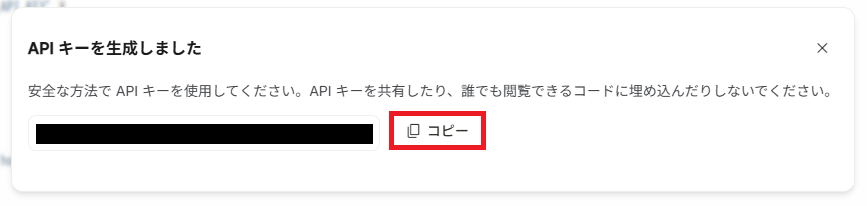 APIキーが生成されるので、「コピー」をクリックしてAPIキーをコピーします。
