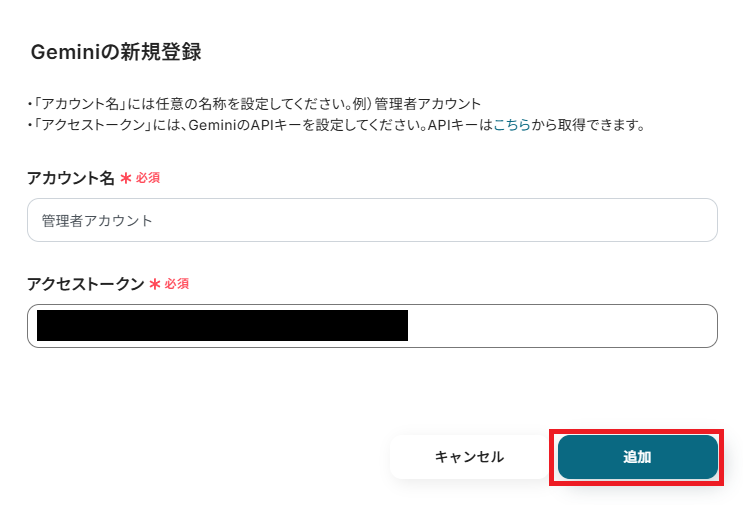 Yoomに戻り、「アクセストークン」にコピーしたAPIキーを貼り付けてください。 全ての設定が完了したら、「追加」をクリックしましょう。