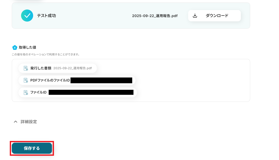 取得した値を確認し、テストに成功していれば「保存する」を押してください。 ダウンロードボタンを押して、正しく書類が作成されているか確認してみましょう。