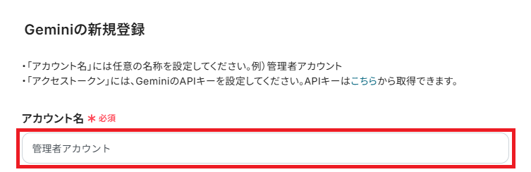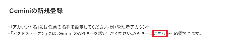 「アクセストークン」は、Geminiから取得できるAPIキーを設定します。 詳しくは下記赤枠を押してください。