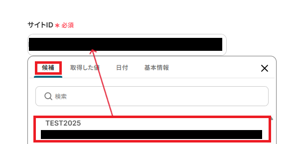 「サイトID」は、ボックスをクリックすると連携済みのサイトIDが表示されるので、使用したいサイトIDを選択してください。