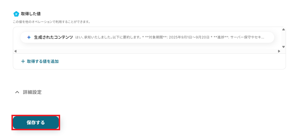 確認できたら、Yoomに戻り「保存する」を押してください。