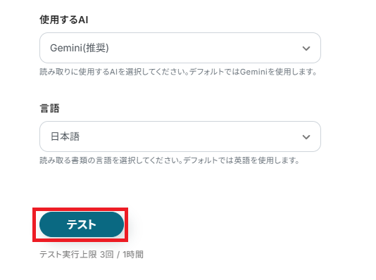 「使用するAI」と「言語」は、変更があれば任意で設定可能です。 全ての設定が完了したら「テスト」を押してください。