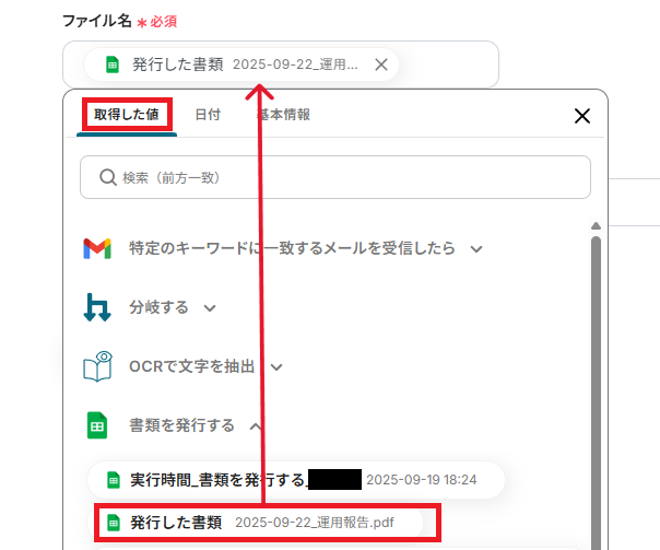 「ファイル名」は、先ほど取得したGoogle スプレッドシートの書類を設定しましょう。 取得した値から選択可能です。
