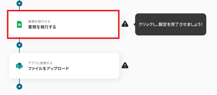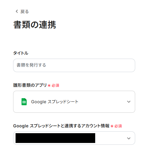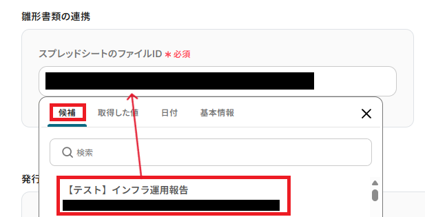 雛形書類の連携を行います。 「スプレッドシートのファイルID」は、ボックスをクリックすると連携済みのIDが表示されるので、先ほど作成したファイルを選択しましょう。
