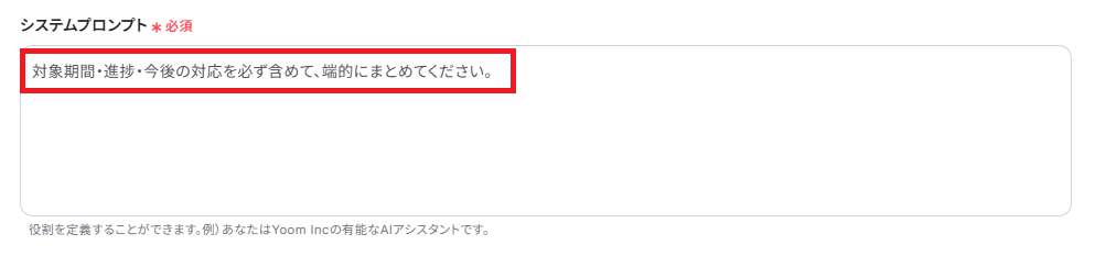 「システムプロンプト」は、AIに対して期待される動作や振る舞いを指示するものです。 詳細に設定することで、より意図に沿った要約の生成が可能です。 今回は以下のように設定しました。