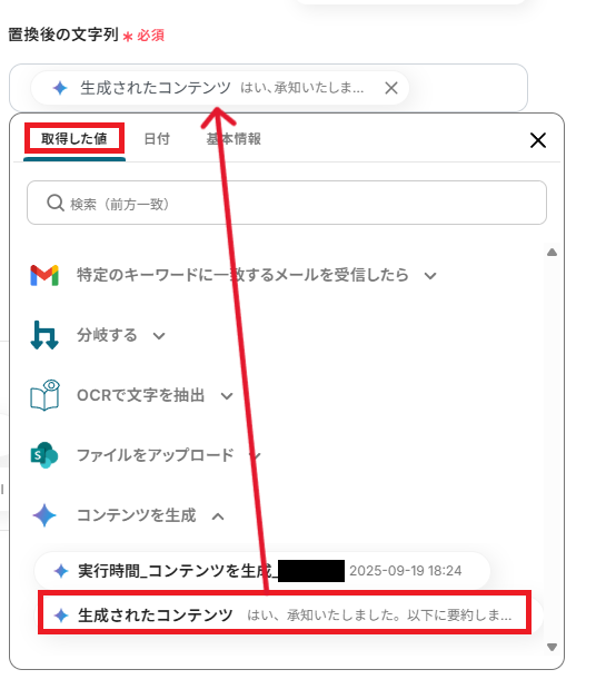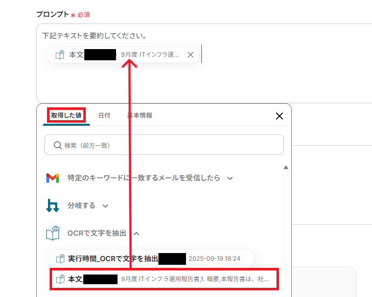 「プロンプト」をOCRで取得した値を活用し、設定しましょう。 取得した値を活用することで、固定値ではなく、トリガーが実行されるたびに最新の情報が反映されます 。
