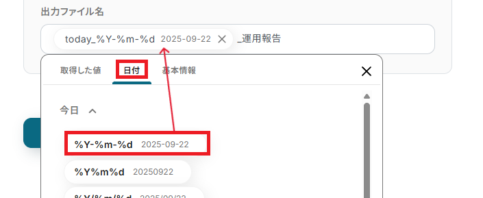 「出力ファイル名」は、任意で自由に設定可能です。 今回は「日付」を活用しファイル名を設定しました。 入力が完了したら次へ進みましょう。