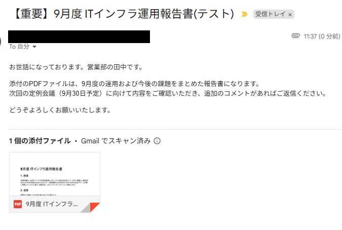 ここまでの設定が完了したら、テスト操作の準備を行います。Gmailで件名にキーワードを含んだメールを作成し、送信しましょう。 作成するメールは、架空の情報(「テストレポート」や「テスト会議」など)でOKです。 また、ファイルの添付 を必ず行ってください。