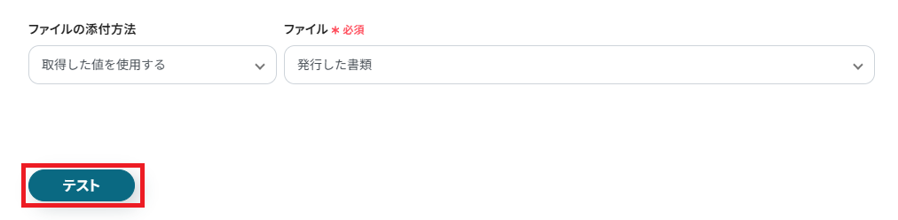 ファイルの添付方法は「取得した値を使用する」、ファイルは「発行した書類」になっていることを確認し、「テスト」をクリックします。