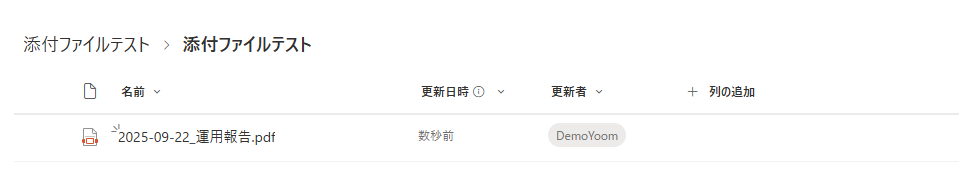 テストに成功すると、実際Microsoft SharePointにファイルがアップロードされているので確認してみましょう。