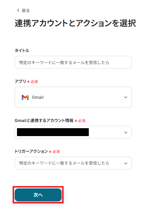 クリックすると以下の画面に切り替わります。 「タイトル」は任意で変更も可能です。 Gmailと連携するアカウントに間違いがないかを確認し、「次へ」をクリックしましょう。