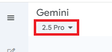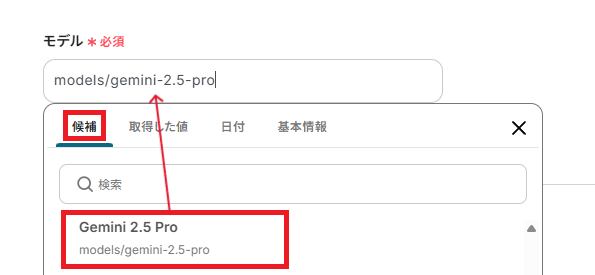 「モデル」は、Geminiのモデルタイプを入力します。 Geminiのページ左上で確認し、同じものをモデルとして設定します。